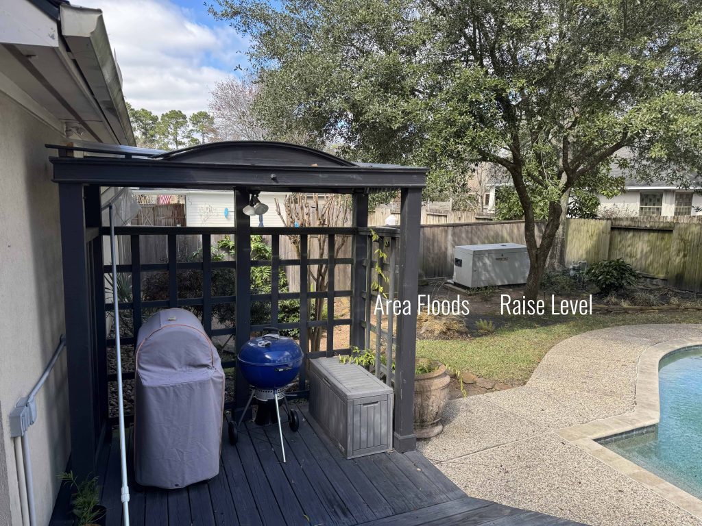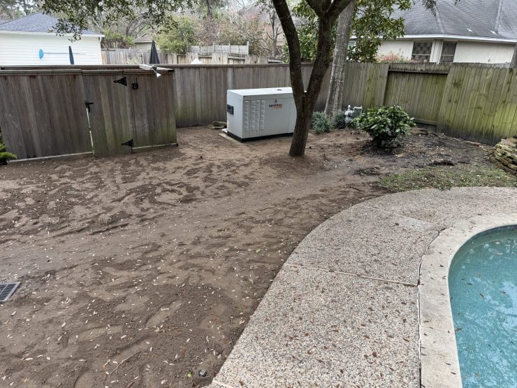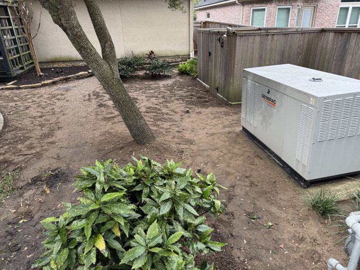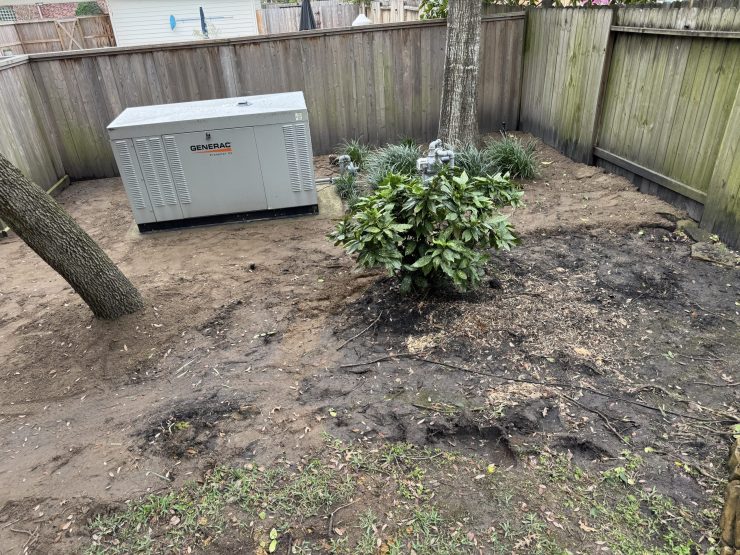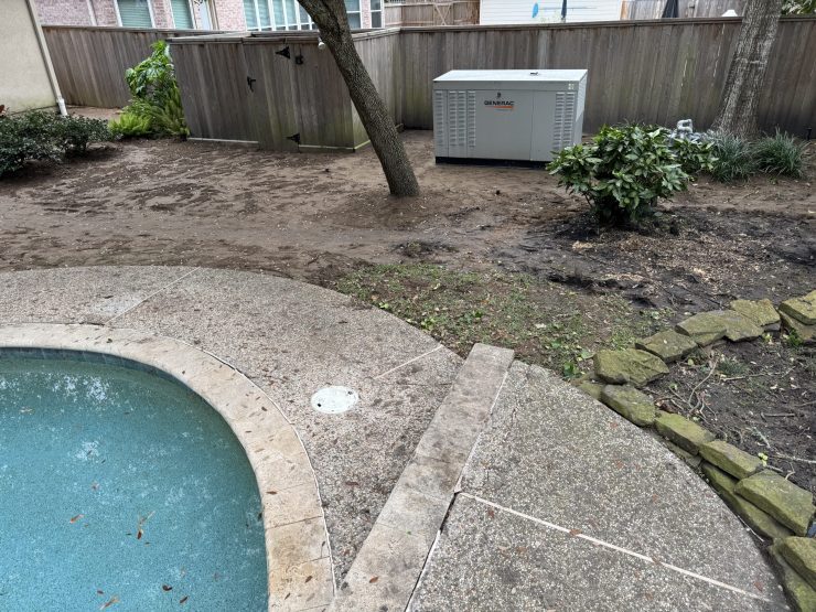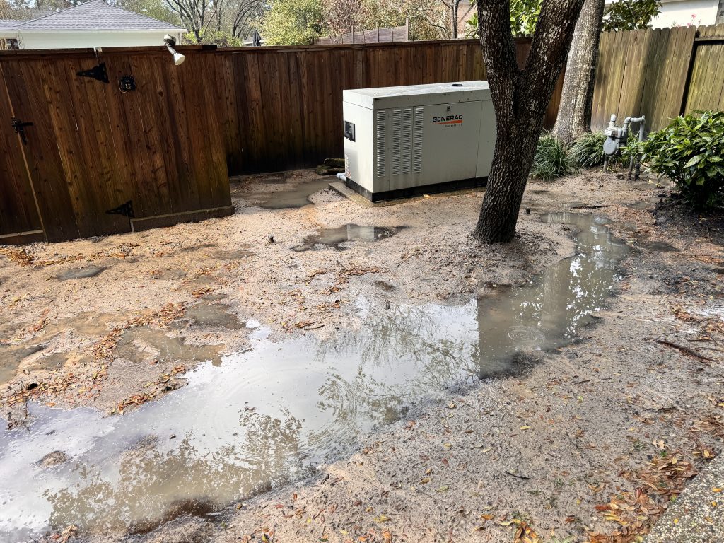 Low spots are clearly visible. The new grate position for the drainage is too high. An additional issue is that the generator is no longer level. Instead of adding to the drainage pipes, a better solution might be to install a French drain with a catch basin.