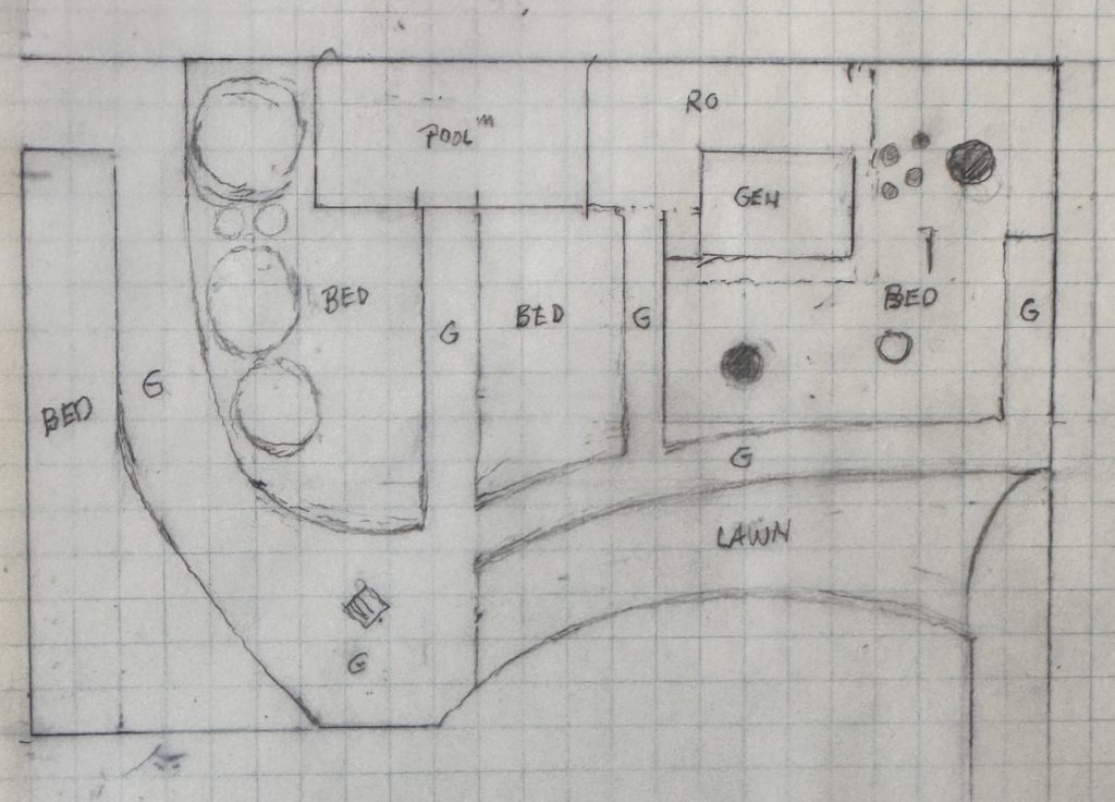We are looking to create a permanent solution for the drainage problem. The two alternatives are extending the drainage system or installing a French drain with a catch basin. After that, additional soil is needed to level the ground. Next is the creation of walkways, beds, and turf, as proposed in the sketch above.